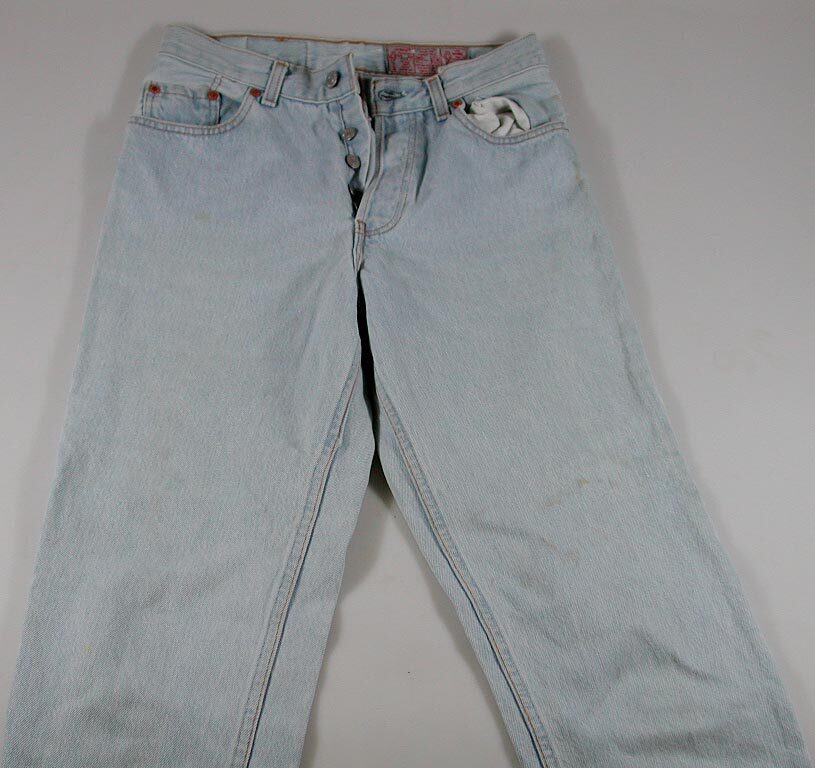 Lichtblauwe spijkerbroek met smalle, rechte pijp. Halfronde steekzakken en opgestikte achterzakken. Gulpsluiting d.m.v. vier metalen knopen met in relief 'Levi-Strauss & Co, SF.CAL.'