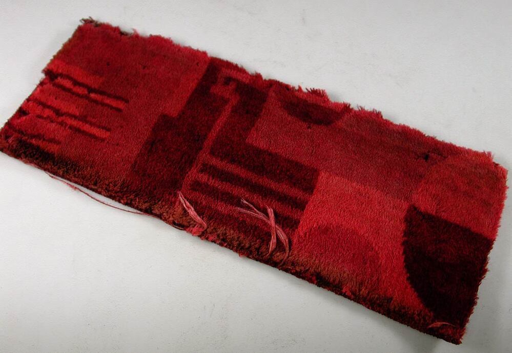 Vloerbedekkingsfragment uit Tuschinski. Poolweefsel uit de jaren 30, van wol in verschillende kleuren rood. Geometrisch motief. Waarschijnlijk afkomstig uit de grote zaal of de wandelgang.- Trefwoorden