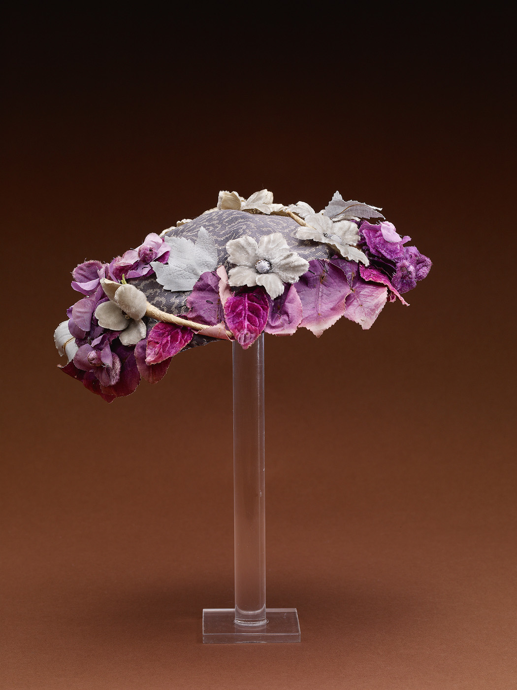 Bolletje van grijze katoen met ingeweven motief in lichtgrijs, gezet op een laitondraad. Rondom versierd met kunstbloemen van fluweel en zijde, in verschillende tinten grijs en paars. Voering van grijs nylon tule.