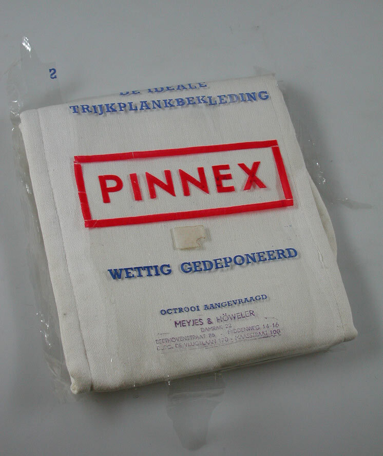 Katoenen strijkplankbekleding, tegengevoerd met molton. In originele cellophane verpakking met opdruk in rood en blauw: Merk: Pinnex. Met stempel in blauw van Meyjes & Höweler, Damrak 22.
