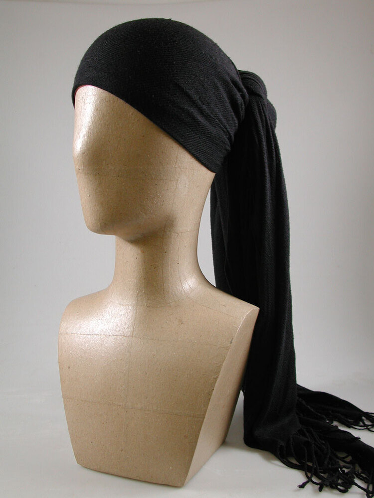 Zwarte, langwerpige sjaal met franje. Sporthoofddoek.- Trefwoorden