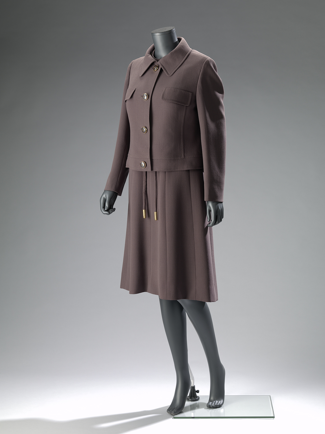 Bruin complet, bestaande uit een jurk en een jasje. Dit complet is gedragen door Mw. Wynkoop, ter gelegenheid van het huwelijk van haar dochter Mw. Iliohan, eigenaresse van de zwarte trouwjurk KA 22151.