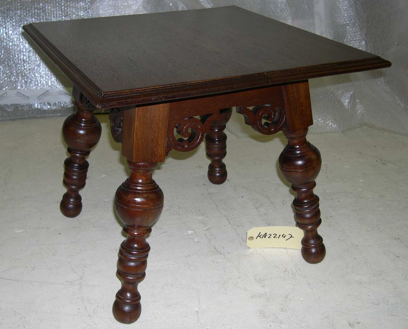 Laag neo-renaissance bijzettafeltje van massief eiken. Tafel rust op vier sterk schuingestelde gedraaide balusterpoten. Regels zijn uitgevoerd met ajourgezaagde consolestukken. Blad is met wervels op onderstel bevestigd. Verbinding tussen regels en poten is verstevigd met hoekklossen. Afwerking: bruin gebeitst, glanzend gevernist