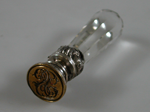 Deze glazen en zilveren zegelstempel komt uit het bezit van de Petronella Betsy "Pé" Doyer, de eerste vrouw van de Amsterdamse architect Abraham Salm (1857-1915). Samen met zijn vader Gerlof Bartholomeus Salm (1831-1897) heeft Abraham een grote bijdrage geleverd aan de stedenbouwkundige veranderingen in Amsterdam in de tweede helft van de negentiende eeuw. Waar G.B. Salms naam onlosmakelijk verbonden is met de bouw van Artis in de Plantage, staat zoon Abraham vooral bekend om zijn herenhuizen, stadsvilla’s, (sigaren)fabrieken en paardentramremises, aanvankelijk in classicistische, later in meer historiserende eclectische stijl. Daarnaast ontwierp hij ook interieuronderdelen. Deze zegelstempel is afkomstig uit het door A. Salm ontworpen huis aan de Weesperzijde 26, waar hij en Petronella woonden en werkten. ( Sarah Remmerts de Vries)