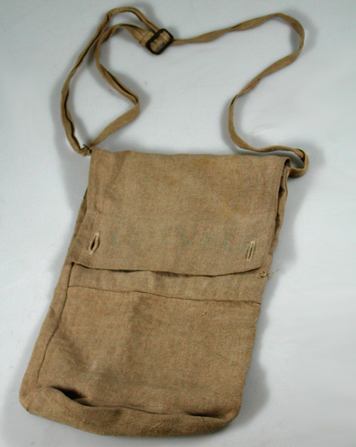 Linnen tas met klep aan voorzijde, gesloten met twee knopen en knoopsgaten (knopen ontbreken). Verstelbare schouderriem van katoen, bevestigd aan tas met koperen gespen.- Trefwoorden