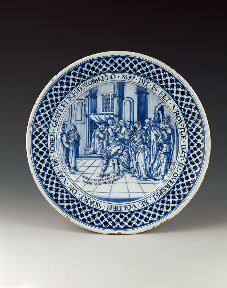 Schotel met gele scherf. Geheel geglazuurd in lichtblauwe/witte achtergrond, met een figuratieve versiering en een randversiering uitgevoerd in donkerblauw glazuur. Schotel heeft brede, schuin oplopende, vlakke bordrand met een naar binnen in een holle zijde lopend naar een vlakke bodem. Op centrale vlak van bord is een bijbelse voorstelling aangebracht van Jezus in de tempel, in voorovergebogen houding en een tekst schrijvend op de grond: DIE SONDER SONDEN IS DIE WERPT/ DEN EERSTEN STEEN/ OP HAR/. Om voorstelling staat rondschrift: ANNO. 1651. DIT. IS. HET. VROUTGE. DAT. IN. OVER. SPEL. BE. VONDEN. WART. OM. VAN. DE. IODEN. GESTEE. NICH. TE. WOR. DE. Op bordrand, een brede randversiering.
