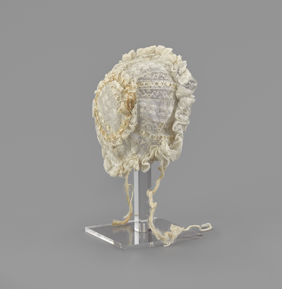 Witte muts van randen van machinale kant, entre-deux en machinaal borduurwerk. Langs de rand is een dubbele strook geplooide kant aangebracht.