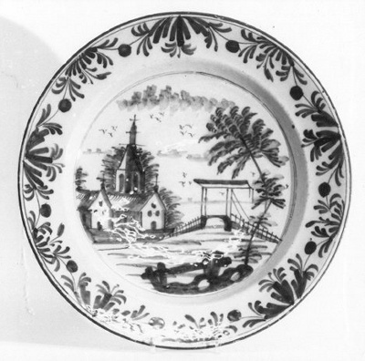 rand: bladmotief; midden: landschap met kerk en ophaalbrug- Trefwoorden