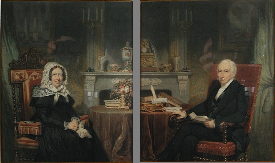 Twee geaquarelleerde portretten in contemporaine lijsten.