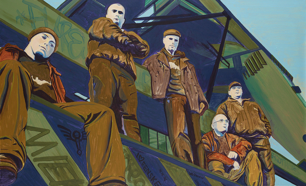 De vijf muzikanten op dit schilderij zijn de leden van de hiphopgroep Osdorp Posse uit Amsterdam Nieuw-West. Osdorp Posse stond aan de wieg van de Nederlandstalige rapmuziek en gebruikte als eerste de term ‘nederhop’ om hun muziek te omschrijven. Het schilderij van de HipHopHelden is vervaardigd door Def P (Pascal Griffioen), frontman van Osdorp Posse. Na een twintigjarig bestaan gaf de hiphopband in 2009 een laatste afscheidsconcert. Def P maakt tegenwoordig nog steeds muziek, maar is ook actief als schrijver, beeldend kunstenaar en theatermaker. ( Sarah Remmerts de Vries)
