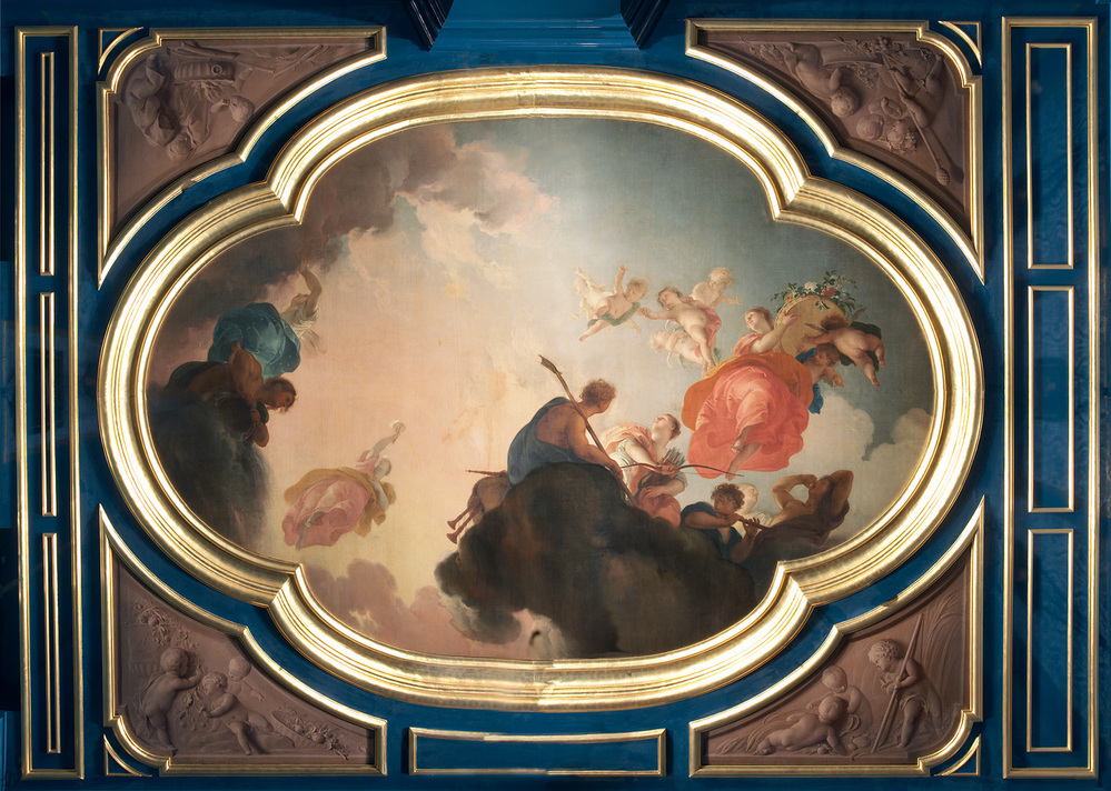 Ovaal middenstuk voorstellende de dageraad. Een allegorie van een allegorie van een vrouwen- en mannenfiguur. Rechts op de voorgrond zijn een herder, een fluitspeler en een vrouw met boog en pijlenkoker op een wolk. Daar boven zweven een vrouw met bloemenkrans en enkele putti.