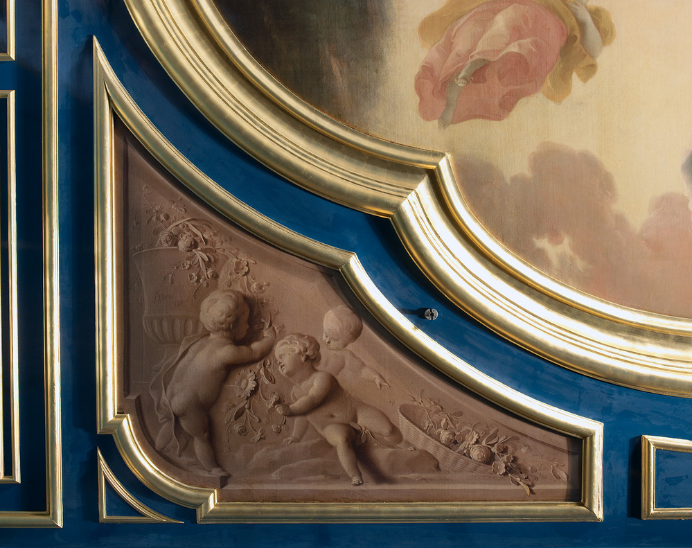 schenking 1891-02-10 inv.nr. SA 38089.2 te zien in Huis Willet-Holthuysen, Herengracht 605, Amsterdam Zuidooster zijstuk van beschilderd plafond voorstellende drie putti en een hoge tuinvaas. Rechts een mand met bloemen.