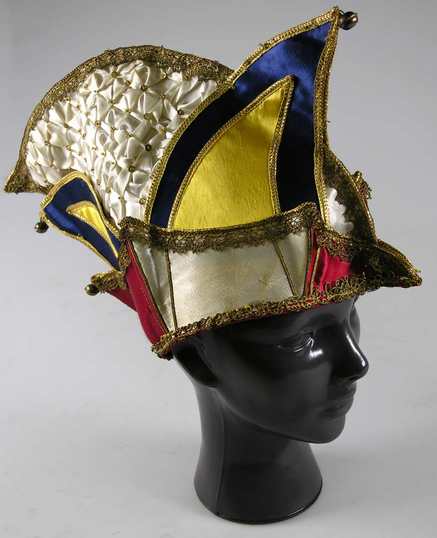 Muts van blauw, rood, geel en wit satijn, gezet op karton en gaas voor stevigheid. Aan punten van muts zijn kleine koperen rinkelbelletjes bevestigd. Entrée is bruinleren band, afgezet met goudband en -kant.- Trefwoorden