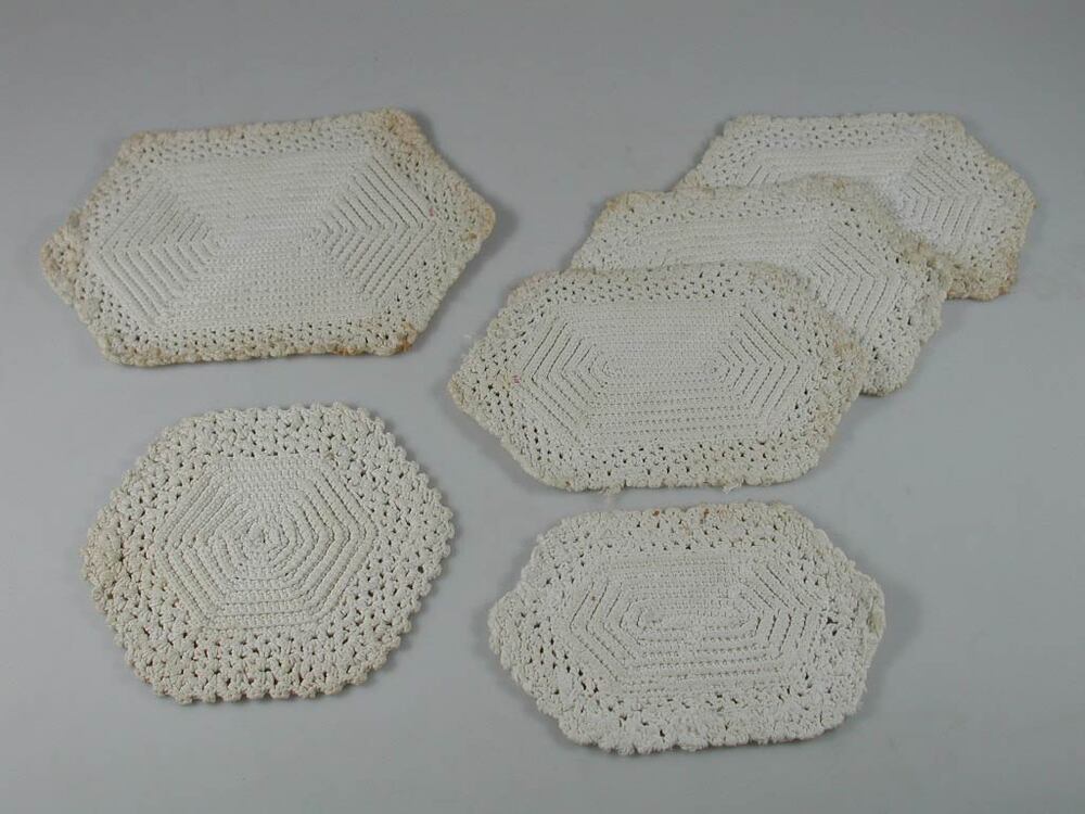 Zeshoekige gehaakte onderzetter van wit katoen.- Trefwoorden