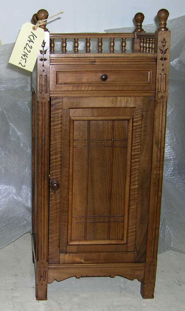 Nachtkastje in massief noten, voorzien van lade bovenin en (rechtsdraaiend) deurtje eronder met daarachter twee legplanken. Rustend op geprofileerde stijlen, bekroond met bolvormen, onderling verbonden door regels en rond bovenblad aan drie zijden een lage balustrade. Zijwanden en deurpaneel gevuld met kraalschroten. Dunne glansvernis of wasafwerking.