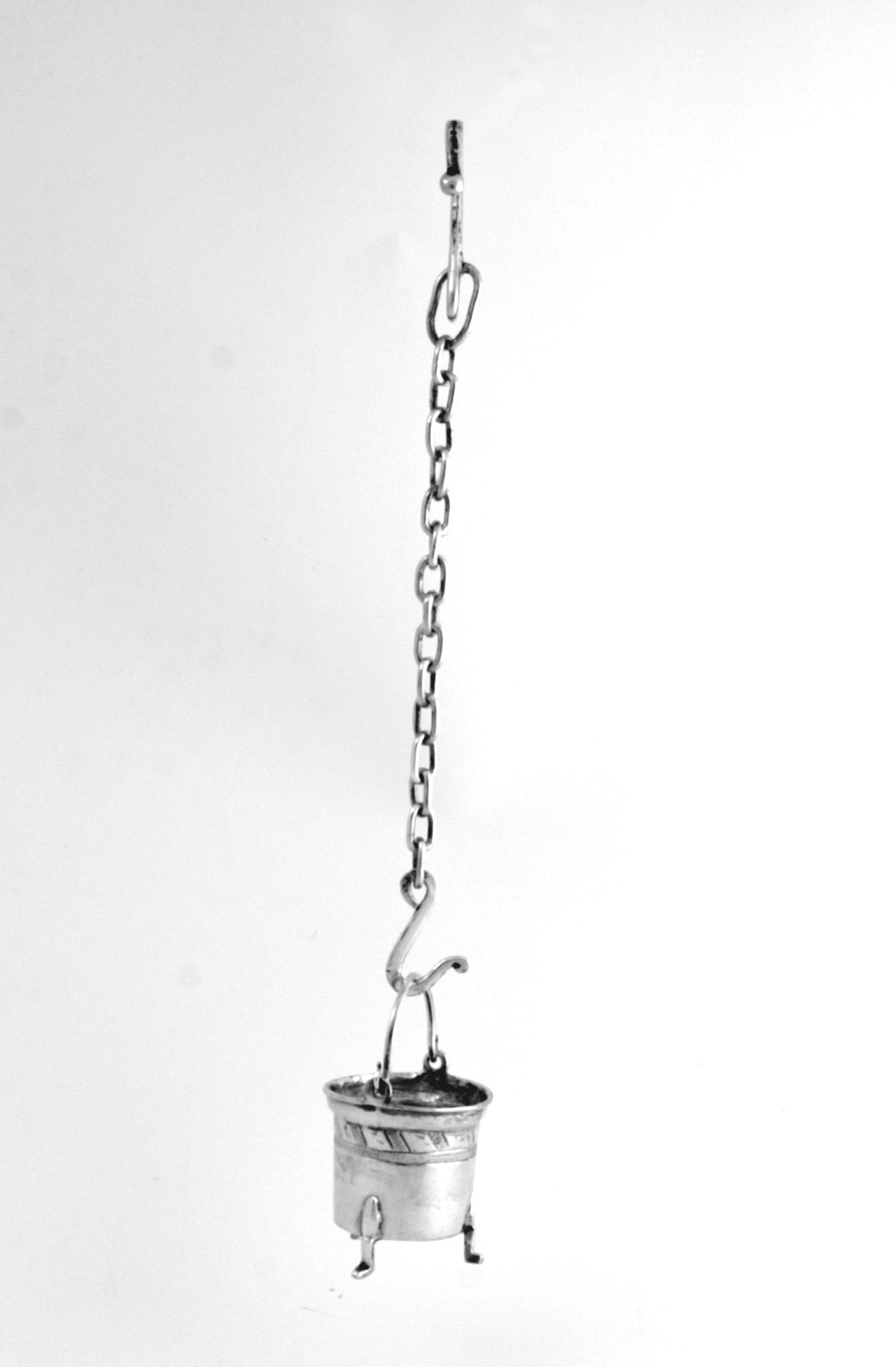 Ronde kookpot staande op drie pootjes, cilindrische wand met gravering; sluitkraag en velsrand waarop twee ogen met glad hengsel eindigend in een S-vorm. Haardketting met een grote dubbele en een kleine enkele haak, 15 kleine schakels en een grote schakel.- Trefwoorden