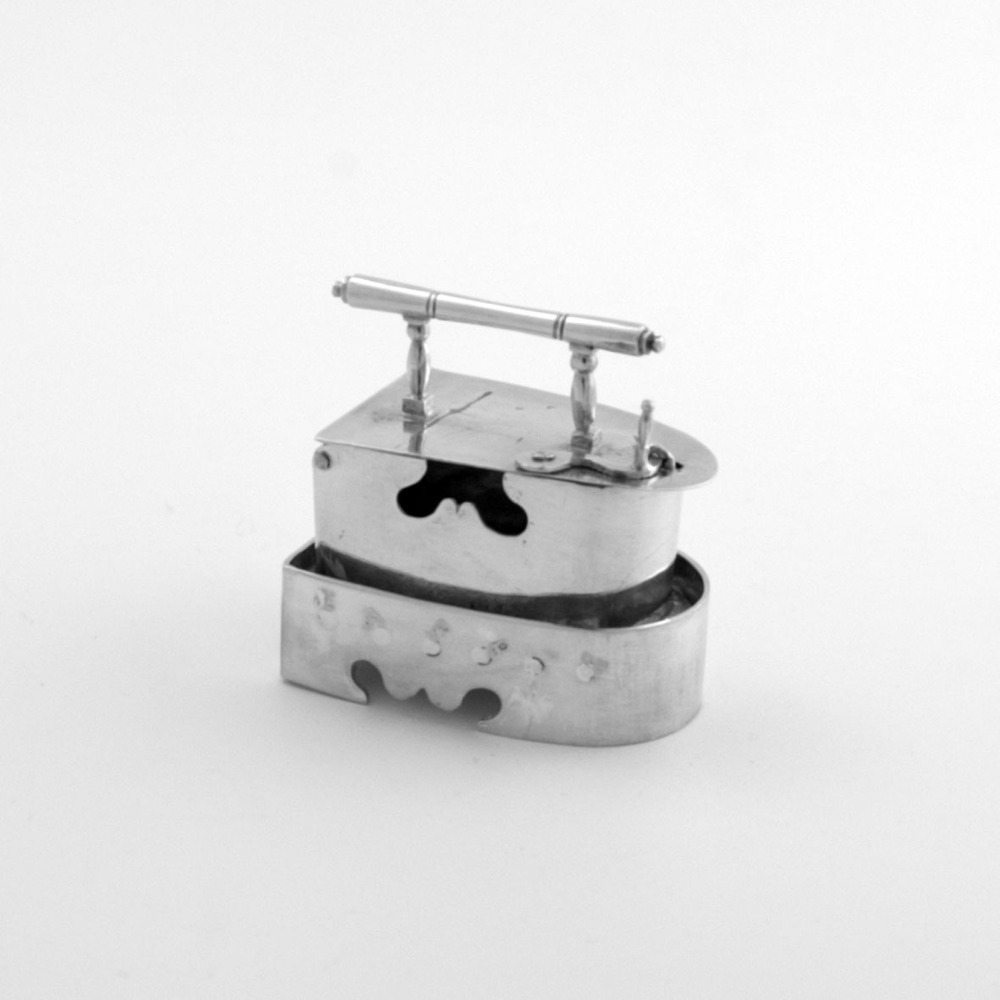 Grootmodel strijkbout met rechthoekige zool en halfronde voorzijde, gladde wand met twee opengewerkte accoladevormige luchtopeningen op de zijwanden, vlak scharnierend deksel met sluithaak waarop twee vertikale geprofileerde steunen met een cilindervormige greep met dubbele ringversiering en knopvormige uiteinden.