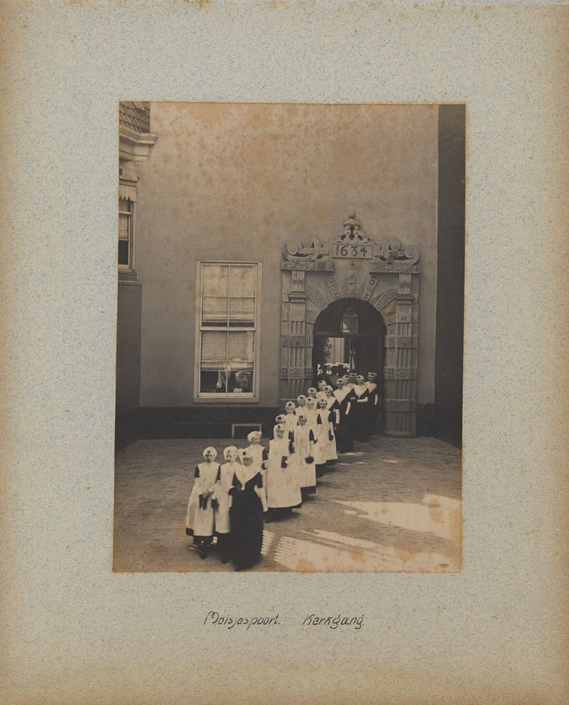 In het Amsterdamse Burgerweeshuis konden kinderen van Amsterdamse poorters (burgers met rechten om in de stad te wonen) terecht, die geen ouders of een moeilijke thuissituatie hadden. Het weeshuis was eeuwenlang een gesloten instelling, waar buitenstaanders niet zomaar naar binnen mochten. Voor de creatie van een fotoalbum, ter ere van het 25-jarige huwelijk van bouwkundige Pieter Heyn in 1904, werd een uitzondering gemaakt. Fotograaf August Stap maakte een unieke serie foto’s van het interieur, de wezen en het personeel van het Burgerweeshuis. Op de foto’s zijn de Burgerwezen tijdens hun dagelijkse bezigheden te zien. Zo komen onder meer de naailes voor meisjes, het ‘Slöjd’-onderwijs voor jongens en de zondagse gang op weg naar de kerk voorbij. Een groot aantal van de foto’s zijn later gebruikt voor de productie van een serie ansichtkaarten in kleur. ( Sarah Remmerts de Vries)