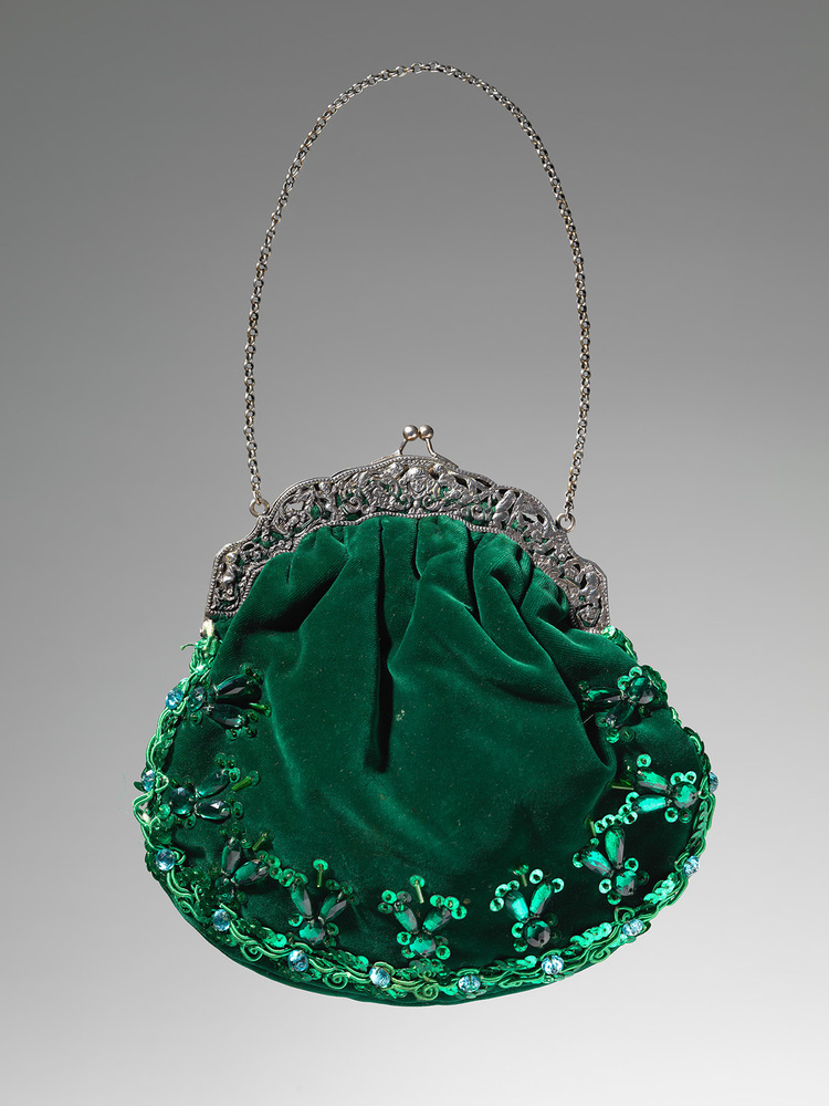 Avondtasje in beugelmodel, van donkergroen fluweel dat afgezet is met pailletten, sierban en glaskralen. Behorende bij avondjapon KA 22314 (Tante Leen, zingen). Gevoerd met donkergroene voeringzijde. Beugel is half rond, geschulpt model met ketting.- Trefwoorden