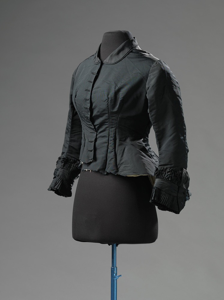 Zwart lijfje van ripszijde, met kraag, lange mouwen en baleinen in de rug. Sluiting middenvoor met (ontbrekende) knopen. Het lijfje is afgeknipt, en was waarschijnlijk onderdeel van een japon in de prinsesselijn. De rugnaden zijn aan de meer rechtere vorm te zien, van na 1875. Witte katoenen voering.