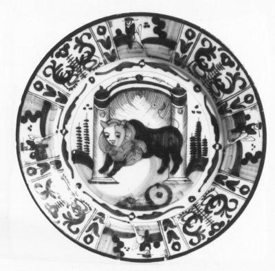 rand: bloemen en figuren; midden: leeuw voor poort- Trefwoorden