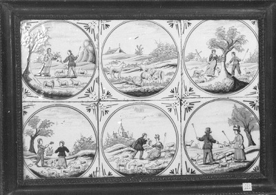 Een tegeltableau is een vlak, bestaande uit meerdere aardewerken tegels, die door een schildering één voorstelling vormen. Tegeltableaus werden vanaf de zeventiende eeuw populair, omdat ze zowel decoratief als functioneel waren. Ze boden uitkomst tegen vocht, waar huisjes langs grachten en kanalen nogal eens last van hadden, en waren gemakkelijk schoon te houden. Daarnaast zorgden de uit Italië afkomstige vormen, kleuren en motieven voor een vrolijke aanblik rond de haard of in de gang. In de periode van de Jugendstil (ca. 1900) leefde de aandacht voor tegeltableaus opnieuw op. Families en bedrijven die het zich konden veroorloven, lieten wanden, gevels en portieken versieren met tegeltableaus in Art Nouveau stijl. Ook voor jubilea en andere feestelijke gelegenheden werden soms tegeltableaus vervaardigd. Een bekende Amsterdamse plateelbakkerij in deze tijd was De Distel (1895-1925), die aan de Valckenierstraat 83-87 gevestigd was. ( Sarah Remmerts de Vries)