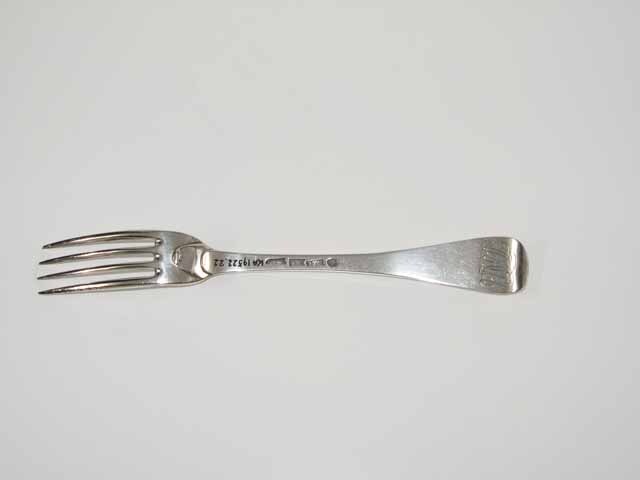 Tafelvork met rechte steel, middenribbe en ronde opstaande kop en dubbel Amsterdams lof. Op onderzijde is een monogram gegraveerd met de initialen: DIACH/, de afkorting van Diaconie Corvershof.
