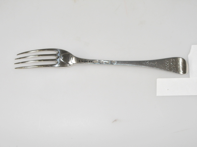 Tafelvork. Steel met middenribbe en omhoog gebogen ronde kop, aan de achterzijde dubbel Amsterdams lof. Op onderzijde steel is een monogram gegraveerd met initialen: D.I.A./ O.V.H./, de afkorting van Diaconie Oude Vrouwenhuis, alsmede een naam van diaken of diaconesse en het jaar van aantreden in die functie.