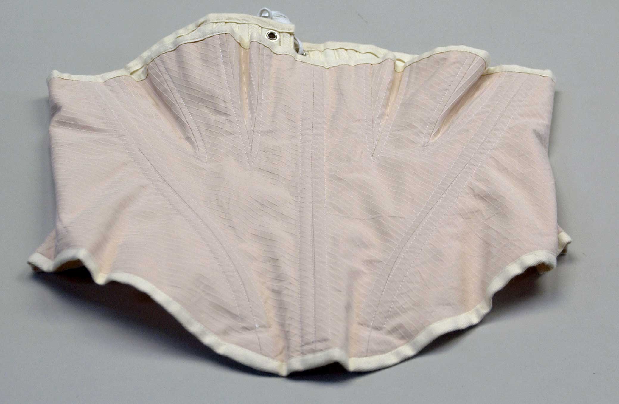 Korset (replica) van zalmroze katoen met een ingeweven streepje. Gevoerd met een stevige naturelkleurige katoen. Met 18 tunnels, verstevigd met evenveel baleinen. Aan de voorzijde lopen de baleinen diagonaal in een punt naar de buik toe. Vier borstgeren geven model aan het korset. Middenachter een rijgvetersluiting, bestaande uit 34 zilverkleurige metalen ogen en een korsetveter. Onder- en bovenzijde afgewerkt met een naturelkleurig keperband.