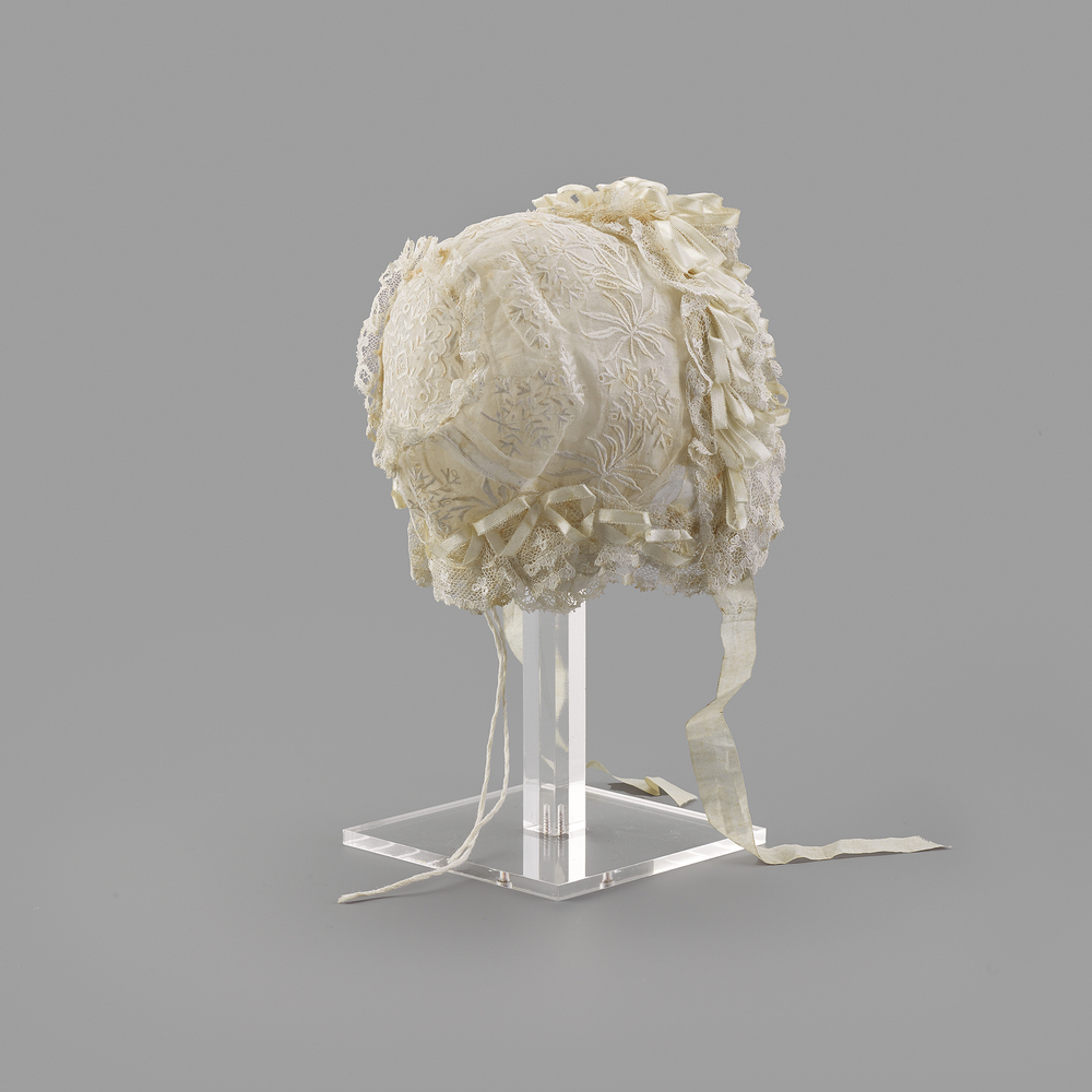 Witte babymuts van geborduurde katoen batist, met rand van zijde linten en kant langs de bovenzijde. Twee zijden linten om onder de kin te strikken.
