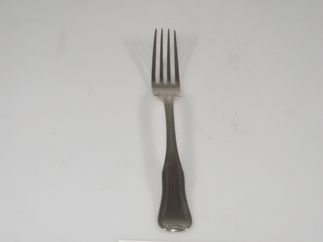Tafelvork met gebogen spadelsteel en ronde steelkop. Voorzijde spadel met opstaande filetranden, beginnend en eindigend in oogjes. Voorzijde voorts met dubbele inwaartse filet zonder knopje, de achterzijde met een enkel inwaartse filet met bijpassend lof.