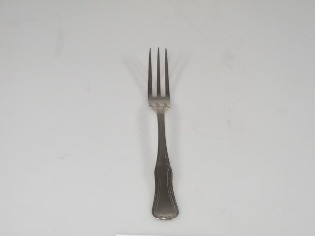Dessertvork met gebogen spadelsteel en ronde steelkop. Voorzijde spadel met opstaande filetranden, beginnend en eindigend in oogjes. Voorzijde voorts met dubbele inwaartse filet zonder knopje, de achterzijde met een enkel inwaartse filet met bijpassend lof.