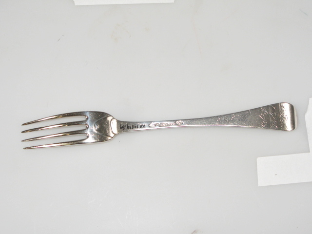 Tafelvork. Steel met middenribbe en omhoog gebogen ronde kop, aan de achterzijde dubbel Amsterdams lof. Op onderzijde steel is een monogram gegraveerd met initialen: D.I.A./ O.V.H./, de afkorting van Diaconie Oude Vrouwenhuis, alsmede een naam van diaken of diaconesse en het jaar van aantreden in die functie.