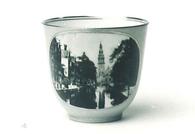 Kop is omgekeerd convex-conisch gevormd, op standring. Met gegolfd oor, zwart met gouden biesje. Op voorzijde van wand een afbeelding van de Zuiderkerk, gezien vanaf de Groenburgwal. Op onderzijde in bovenglazuur, in zwart, het opschrift: Zuiderkerk. Ronde schotel met schuin oplopende rand, op standring. Gouden bies rond middengedeelte. Slijtage aan roze fonds.