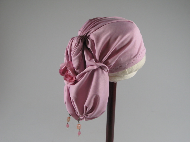 Op maat gemaakte kap, versierd met roze kunstbloem en knopen/kralen.- Trefwoorden