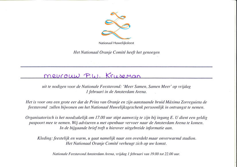 Trefwoorden uitnodiging, huwelijk, Bijlmer, Koninklijk Huis, Koning der Nederlanden Willem-Alexander Claus George Ferdinand, Prins van Oranje-Nassau, Jonkheer van Amsberg, prinses der Nederlanden Máxima, prinses van Oranje-Nassau, Nationaal Oranje Comité, Amsterdam Arena, Pauline W. Krusemandocumentencollectie Amsterdam Museum