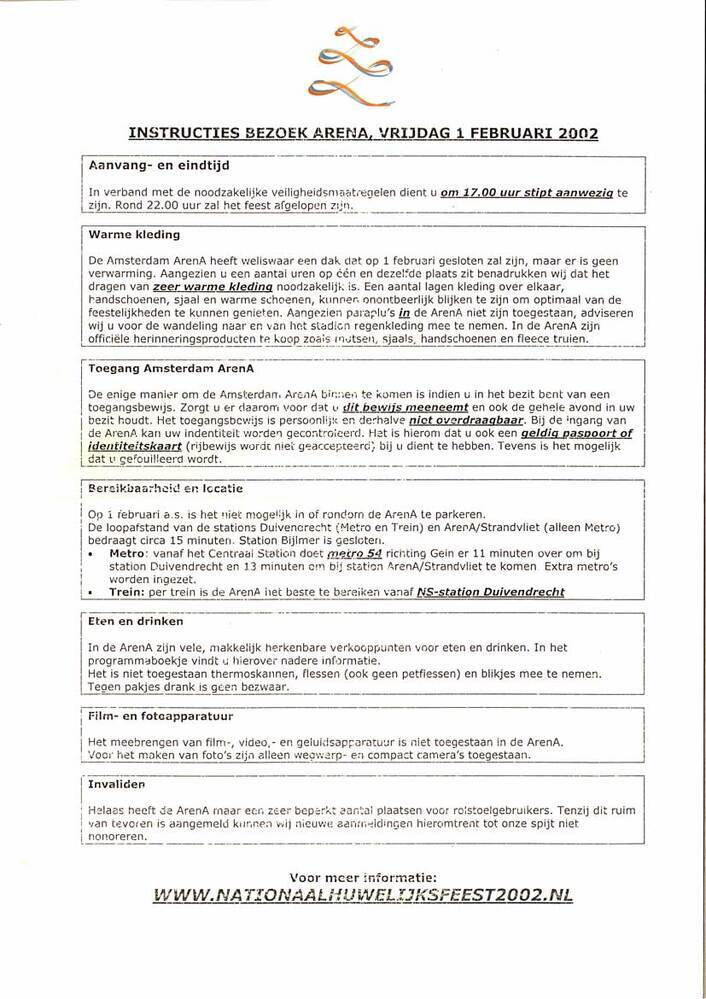 Instructies voor bezoekers van Nationale Feestavond voor Prins Willem-Alexander en Máxima Zorreguieta in Amsterdam Arena, op 2002-02-01, 2002 papier hoogte: 29.7 cm; breedte: 21 cm; schenking 2002-02 inv.nr. A 56429 in depot