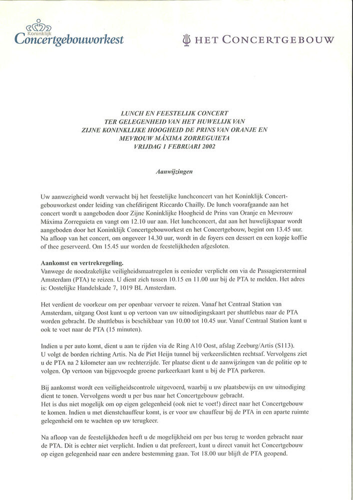Instructies voor bezoekers aan feestelijk lunchconcert in Concertgebouw t.g.v. huwelijk van Prins Willem-Alexander en Máxima Zorreguieta, op 2002-02-02