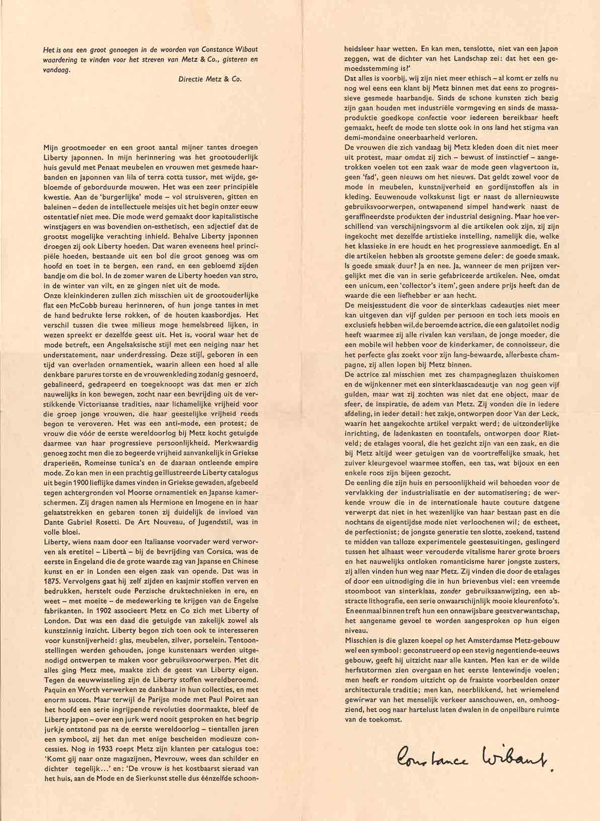 Het economische herstel in de jaren ’50 was zichtbaar in het drukwerk dat omvangrijker, op mooier papier en in kleur werd uitgevoerd en geïllustreerd: nooit de kleding zelf, altijd een sfeersuggestie, een thema. Vanaf ongeveer 1955 werd Metz’ confectie steeds belangrijker. Een nieuwe modelijn werd opgezet: de Josephine collectie. De mode-illustraties hiervoor werden gemaakt naar het type Audrey Hepburn: ultraslanke meisjes met petticoats, of – iets ouder – in een kraagloos mantelpakje met grote knopen en kokerrok. ( Annemarie den Dekker)