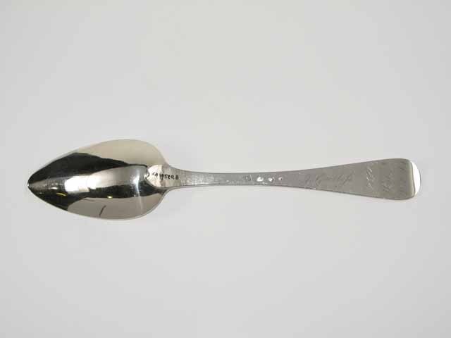 Tafellepel uit de negentiende eeuw, steel met middenribbe en omhoog gebogen ronde kop, aan de achterzijde dubbel Amsterdams lof, ovale lepelbak. Op onderzijde steel is een monogram gegraveerd met de initialen: D.I.A./ O.V.H./, de afkorting van Diaconie Oude Vrouwenhuis, alsmede de namen van de diakenen en diaconessen en het jaar van hun aantreden in die functie.