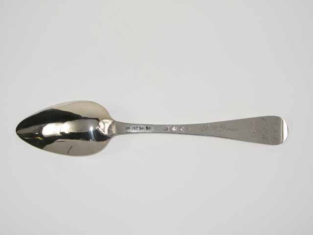 Tafellepel uit de negentiende eeuw, steel met middenribbe en omhoog gebogen ronde kop, aan de achterzijde dubbel Amsterdams lof, ovale lepelbak. Op onderzijde steel is een monogram gegraveerd met de initialen: D.I.A./ O.V.H./, de afkorting van Diaconie Oude Vrouwenhuis, alsmede de namen van de diakenen en diaconessen en het jaar van hun aantreden in die functie.