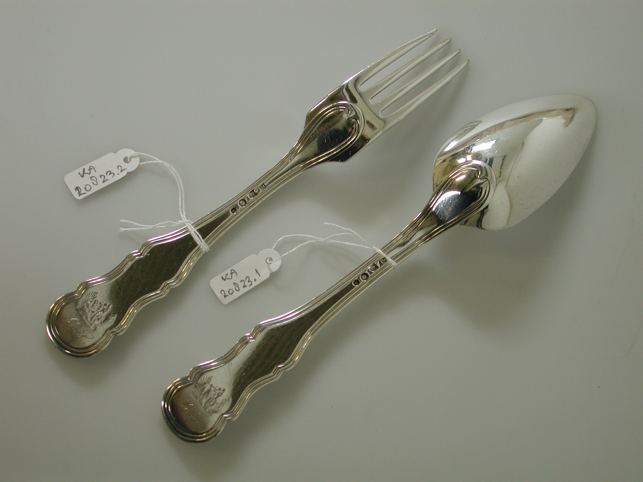 Tafelcouvert, gebogen spadelstelen met contouren en ronde steelknop, puntig ovale lepelbak. Voorzijde spadel met gekrulde, onderbroken dubbele opwaartse randen met oogjes en uitlopend in een punt, de rest van de voorzijde met kraalfilet eindigend in een knopje met oogjes, aan de achterzijde dubbele inwaartse filetranden en bijpassend lof. Op de achterzijde van de stelen zijn de initialen L.S./ onder een helmteken gegraveerd, vermoedelijk van later datum en Engels.