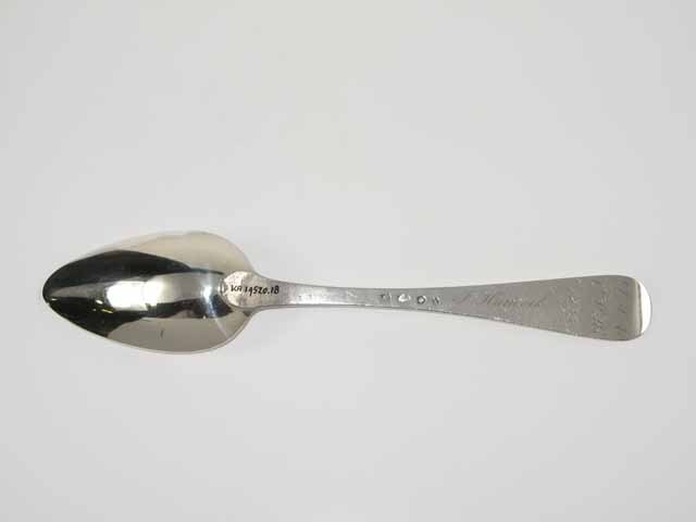 Tafellepel uit de negentiende eeuw, steel met middenribbe en omhoog gebogen ronde kop, aan de achterzijde dubbel Amsterdams lof, ovale lepelbak. Op onderzijde steel is een monogram gegraveerd met de initialen: D.I.A./ O.V.H./, de afkorting van Diaconie Oude Vrouwenhuis, alsmede de namen van de diakenen en diaconessen en het jaar van hun aantreden in die functie.
