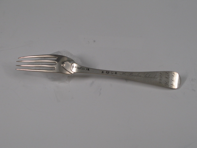 Tafellvork uit de negentiende eeuw, steel met middenribbe en omhoog gebogen ronde kop, aan de achterzijde dubbel Amsterdams lof. Op onderzijde steel is een monogram gegraveerd met de initialen: D.I.A./ O.V.H./, de afkorting van Diaconie Oude Vrouwenhuis, alsmede de naam van diaconesse en het jaar van aantreden in die functie.