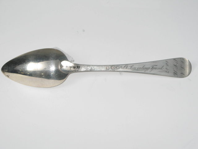 Tafellepel uit de negentiende eeuw, steel met middenribbe en omhoog gebogen ronde kop, aan de achterzijde dubbel Amsterdams lof, ovale lepelbak. Op onderzijde steel is een monogram gegraveerd met de initialen: D.I.A./ O.V.H./, de afkorting van Diaconie Oude Vrouwenhuis, alsmede de namen van de diakenen en diaconessen en het jaar van hun aantreden in die functie.
