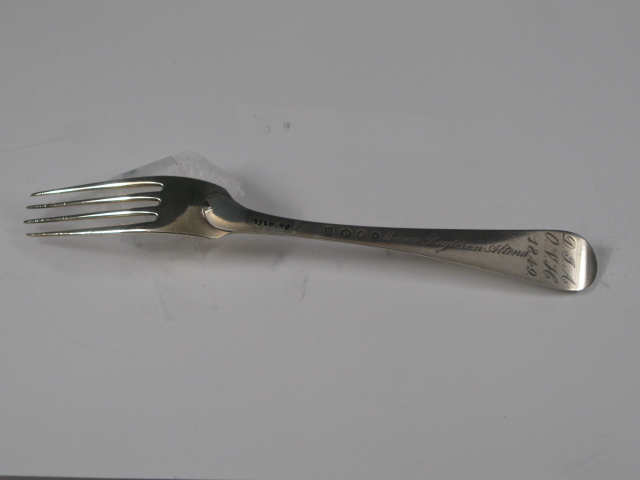 Tafellvork uit de negentiende eeuw, steel met middenribbe en omhoog gebogen ronde kop, aan de achterzijde dubbel Amsterdams lof. Op onderzijde steel is een monogram gegraveerd met de initialen: D.I.A./ O.V.H./, de afkorting van Diaconie Oude Vrouwenhuis, alsmede de naam van diaconesse en het jaar van aantreden in die functie.
