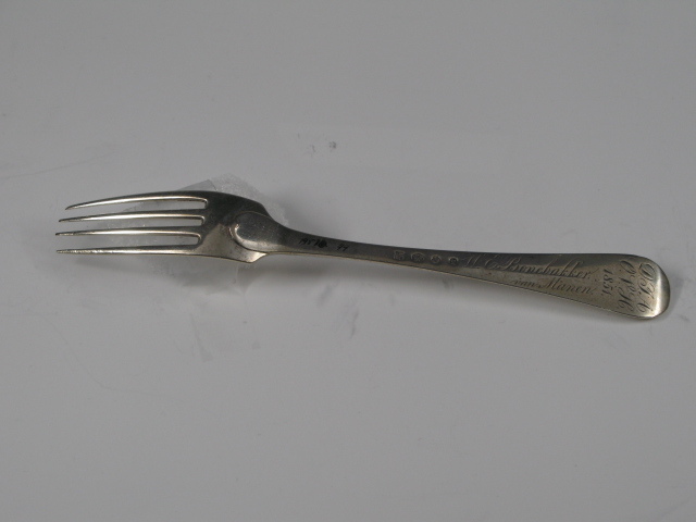 Tafellvork uit de negentiende eeuw, steel met middenribbe en omhoog gebogen ronde kop, aan de achterzijde dubbel Amsterdams lof. Op onderzijde steel is een monogram gegraveerd met de initialen: D.I.A./ O.V.H./, de afkorting van Diaconie Oude Vrouwenhuis, alsmede de naam van diaconesse en het jaar van aantreden in die functie.