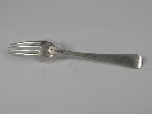 Tafellvork uit de negentiende eeuw, steel met middenribbe en omhoog gebogen ronde kop, aan de achterzijde dubbel Amsterdams lof. Op onderzijde steel is een monogram gegraveerd met de initialen: D.I.A./ O.V.H./, de afkorting van Diaconie Oude Vrouwenhuis, alsmede de naam van diaconesse en het jaar van aantreden in die functie.