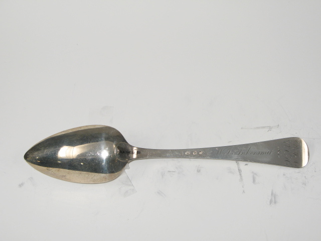 Tafellepel uit de negentiende eeuw, steel met middenribbe en omhoog gebogen ronde kop, aan de achterzijde dubbel Amsterdams lof, ovale lepelbak. Op onderzijde steel is een monogram gegraveerd met de initialen: D.I.A./ O.V.H./, de afkorting van Diaconie Oude Vrouwenhuis, alsmede de namen van de diakenen en diaconessen en het jaar van hun aantreden in die functie.