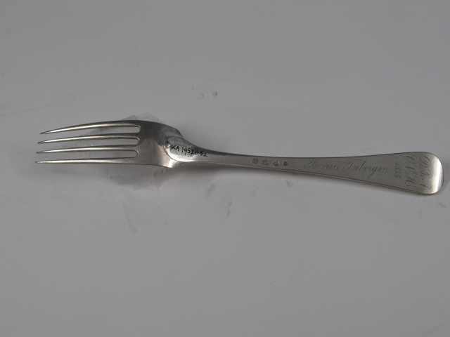 Tafellvork uit de negentiende eeuw, steel met middenribbe en omhoog gebogen ronde kop, aan de achterzijde dubbel Amsterdams lof. Op onderzijde steel is een monogram gegraveerd met de initialen: D.I.A./ O.V.H./, de afkorting van Diaconie Oude Vrouwenhuis, alsmede de naam van diaconesse en het jaar van aantreden in die functie.
